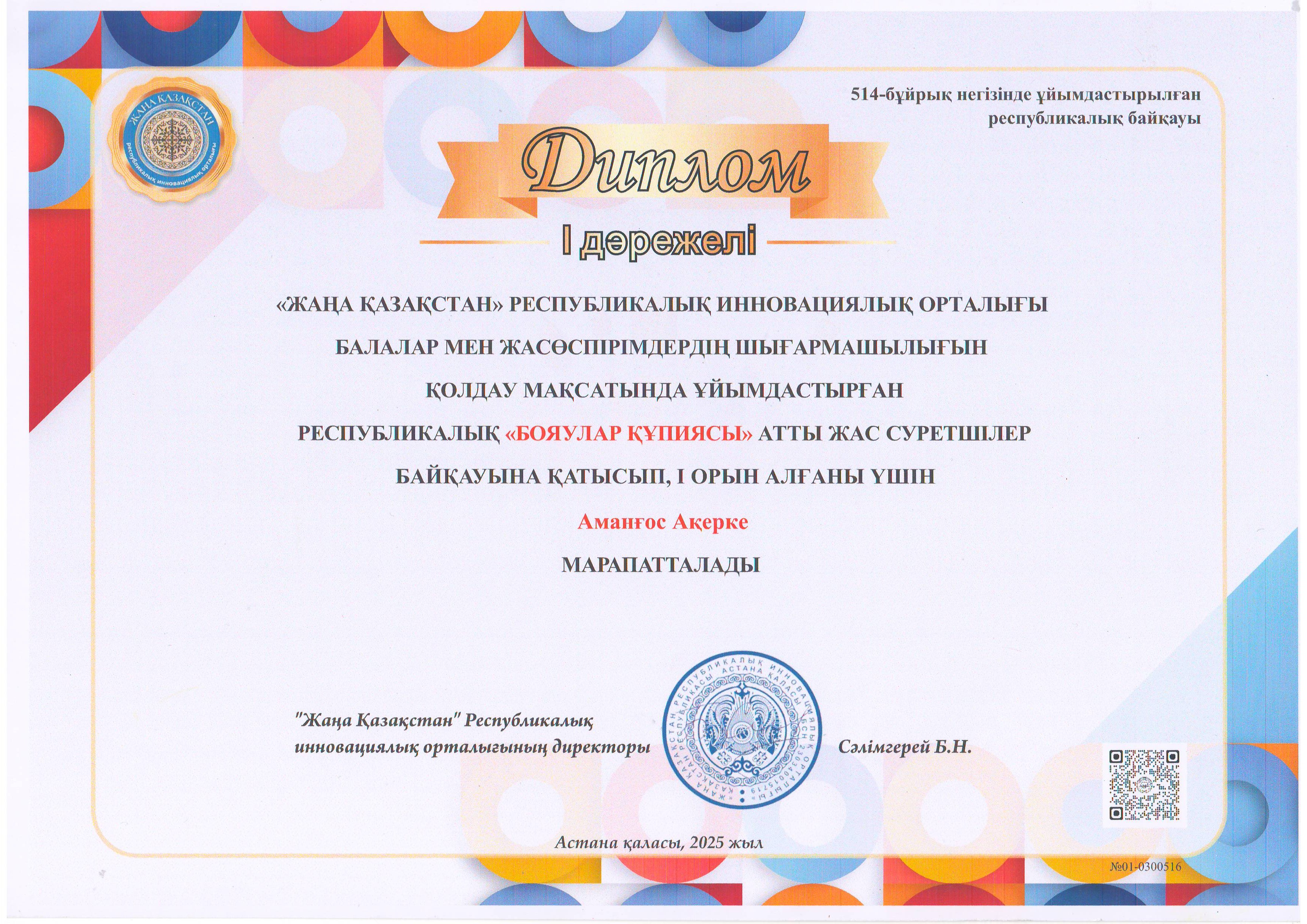 "Жаңа Қазақстан" Республикалық инновациялық орталығы балалар мен жасөспірімдердің шығармашылығын қолдау мақсатында ұйымдастырған республикалық "Бояулар құпиясы" байқауына "Жас суретші" үйірмесінің оқушылары қатысып, Бауыржан Жәңгір, Аманғос Ақерке, Қыдырбек Айдана, Махмет Ару І орын дипломдарын иеленсе, Суйнгарина Асия ІІ орын дипломын иеленді.