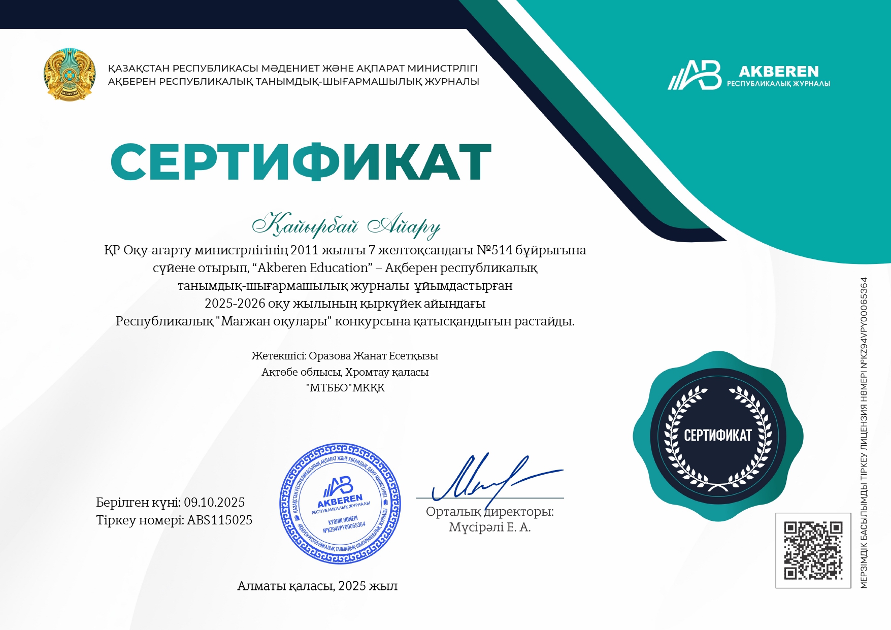 ҚР Оқу - ағарту министрлігінің 2011 жылғы 7 желтоқсандағы №514 бұйрығына сүйене отырып, "Akberen Education" - Ақберен республикалық. танымдық - шығармашылық журналы ұйымдастырған Республикалық "Мағжан оқулары" конкурсына қатысып, І орын иеленгені үшін Қайырбай Айару марапатталды. Жетекшісі Оразова Жанат Есетқызы, құтты болсын!