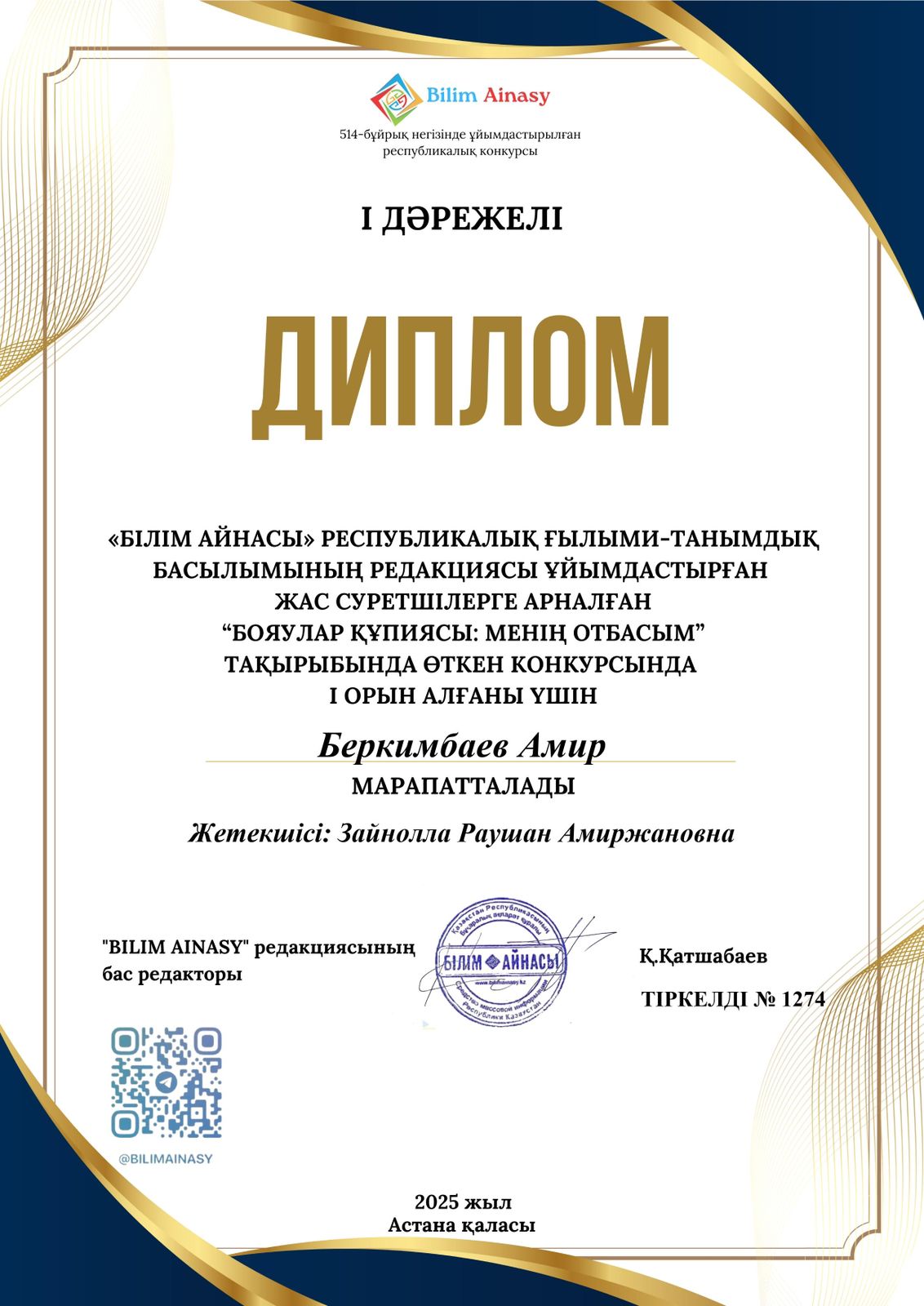 Жас суретшілерге арналған «Бояулар құпиясы: менің сүйікті мультфильмім, менің отбасым» тақырыптарындағы байқауына қатысқан «Волшебная кисточка» үйірмесінің оқушысы Беркімбаев Амир жүлделі І орынға ие болды.